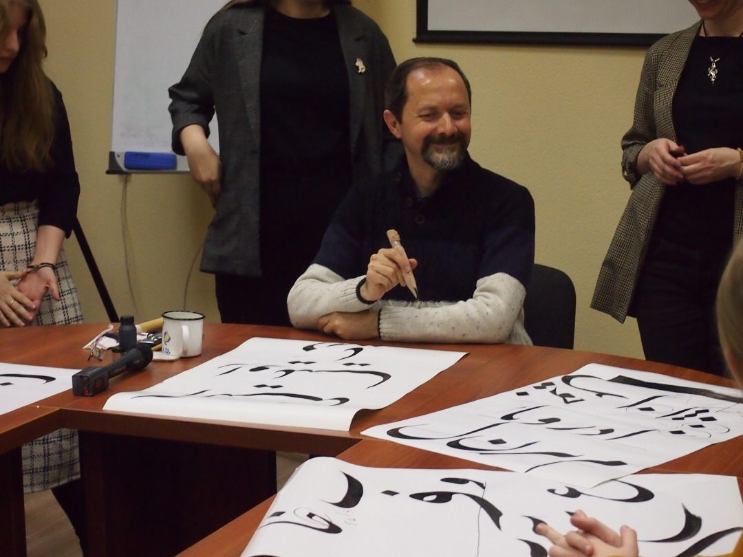 در ادامه خانم دکتر نیکیتنکو از اساتید مدرسه عالی اقتصاد مسکو، نیز نقش هنر در معرفی تمدن و فرهنگ اسلامی را برشمرده و تاکید کردند نیاز به آشنایی با هنر اسلامی برای شناخت هرچه بیشتر و بهتر اسلام امری اجتناب ناپذیر می باشد. ایشان برگزاری چنین جلساتی را برای اساتید و دانشجویان بسیار مفید دانسته و آمادگی مدرسه عالی اقتصاد برای گسترش همکاری در این زمینه را بیان نمودند. در ادامه استاد حمید رضا قلیچ خانی سخنرانی خود را با موضوع «کاتبان و انواع خطوط نسخههای خطی شاهنامه» ارائه داده و با ذکر نمونه هایی به بحث در این زمینه پرداختند. ایشان همچنین مختصری در خصوص کتاب درآمدی بر خوشنویسی ایرانی توضیحاتی ارائه دادند و سپس کارگاه آموزشی خطاطی اسلامی برگزار گردید و مخاطبان از نزدیک با خطهای نستعلیق و ثلث آشنا گردیدند، ایشان در حین خطاطی تاریخچه ای از این دو خط را نیز برای مخاطبان شرح دادند.